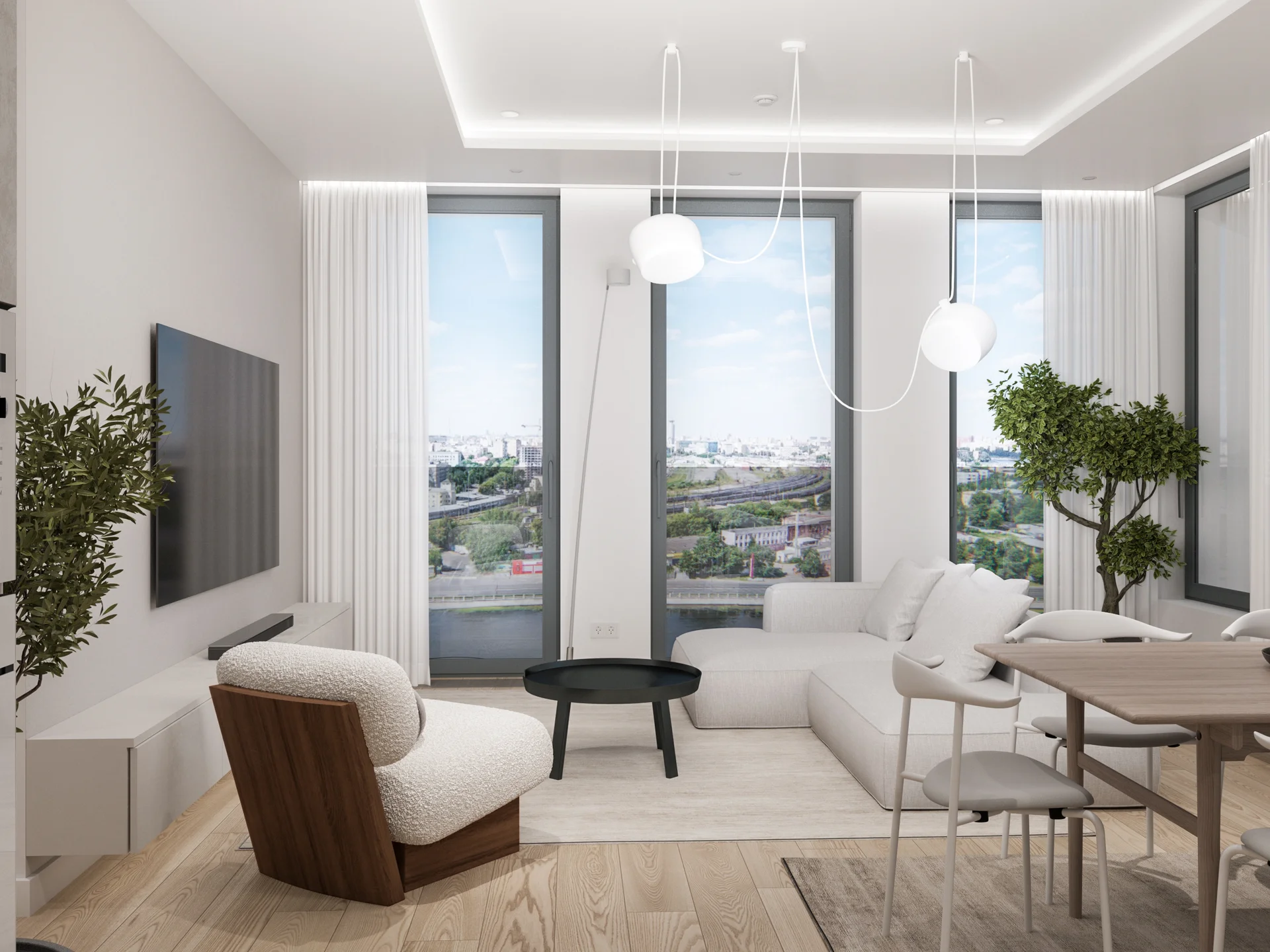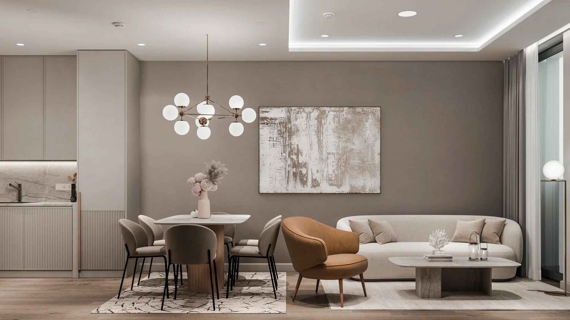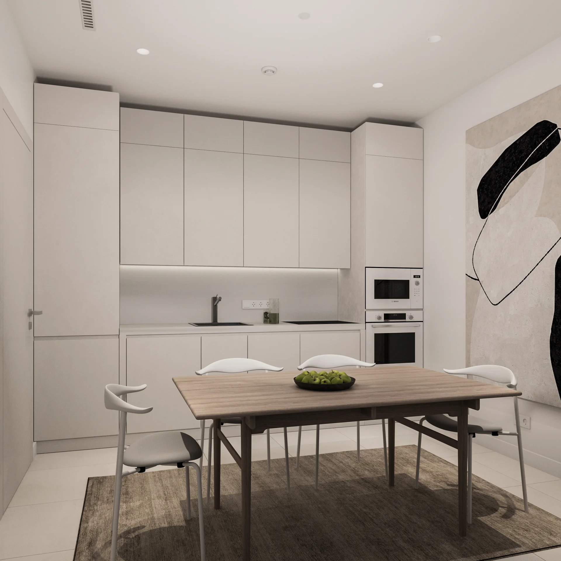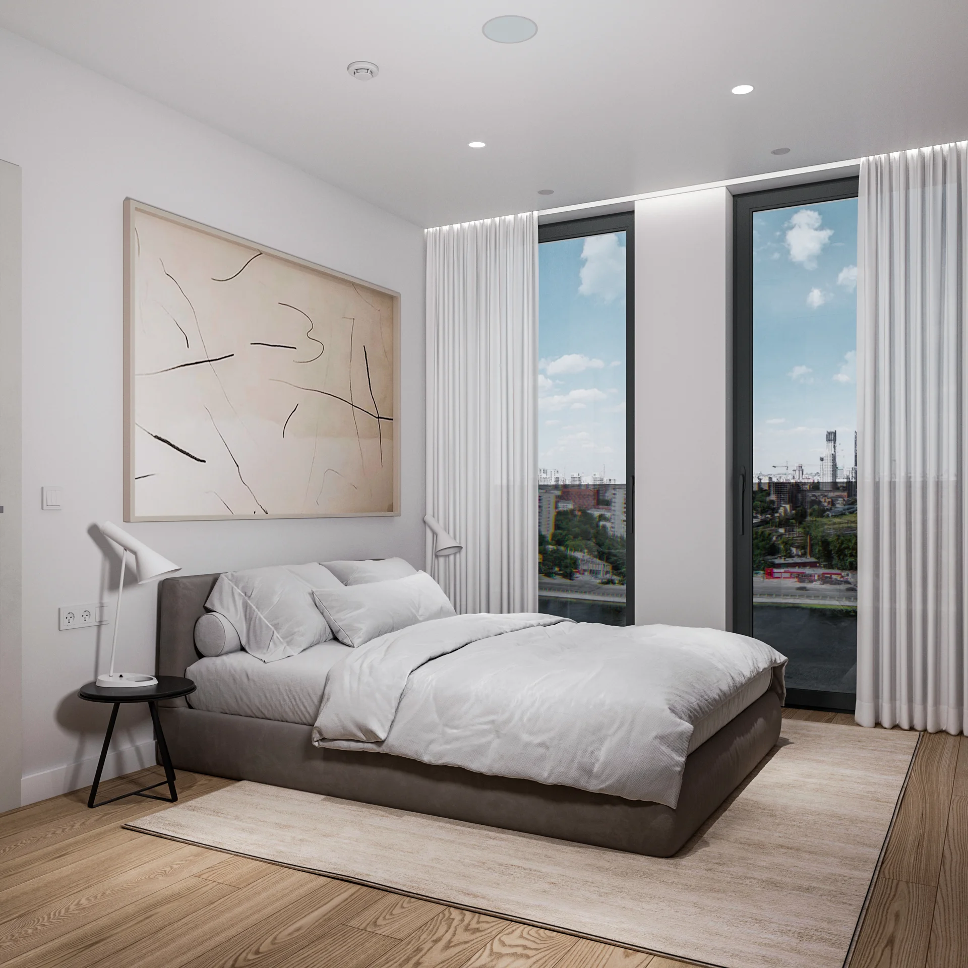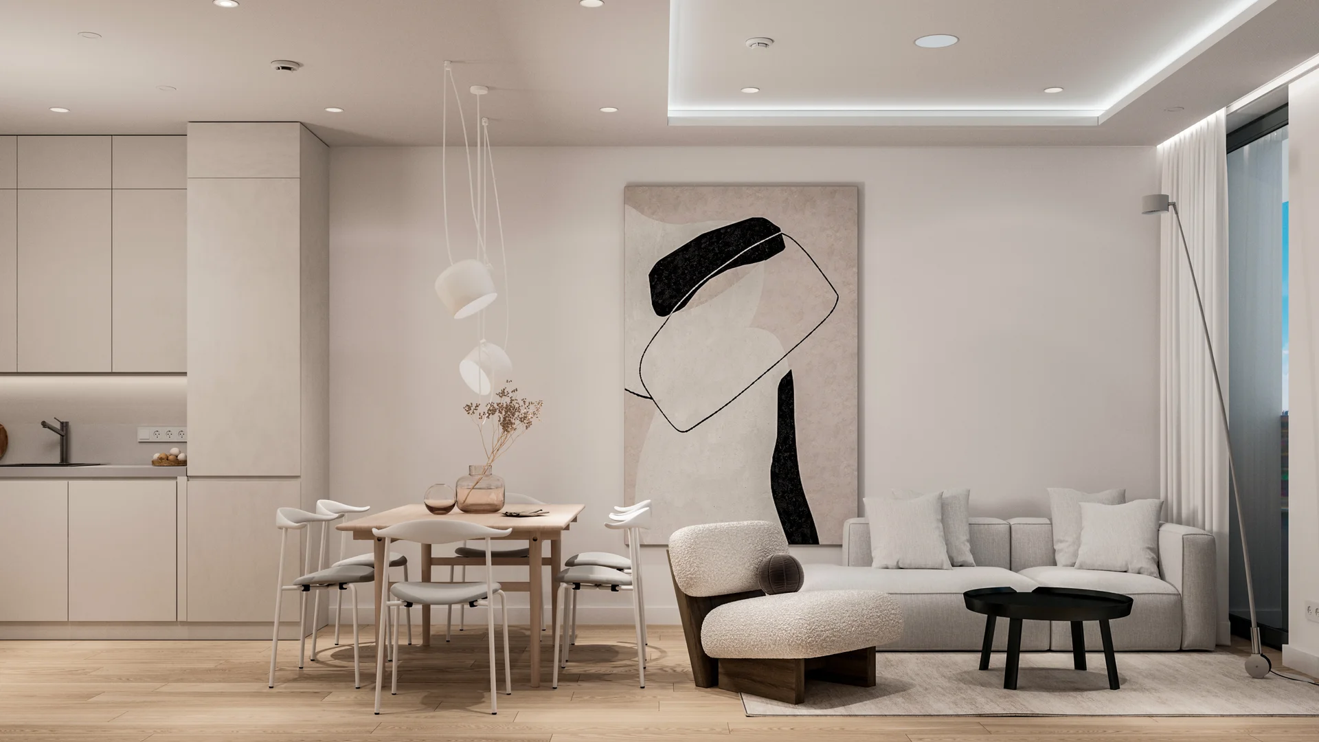 В отделке преобладают геометрически точные линии. Цветовая палитра преимущественно состоит из максимально светлых оттенков, что визуально расширяет пространство и наполняет его светом.