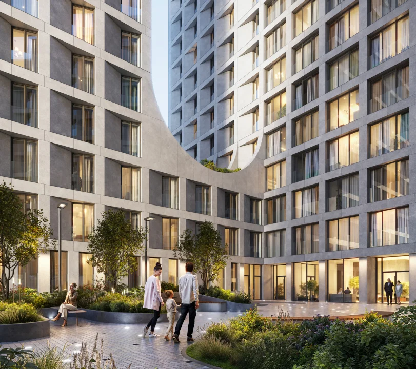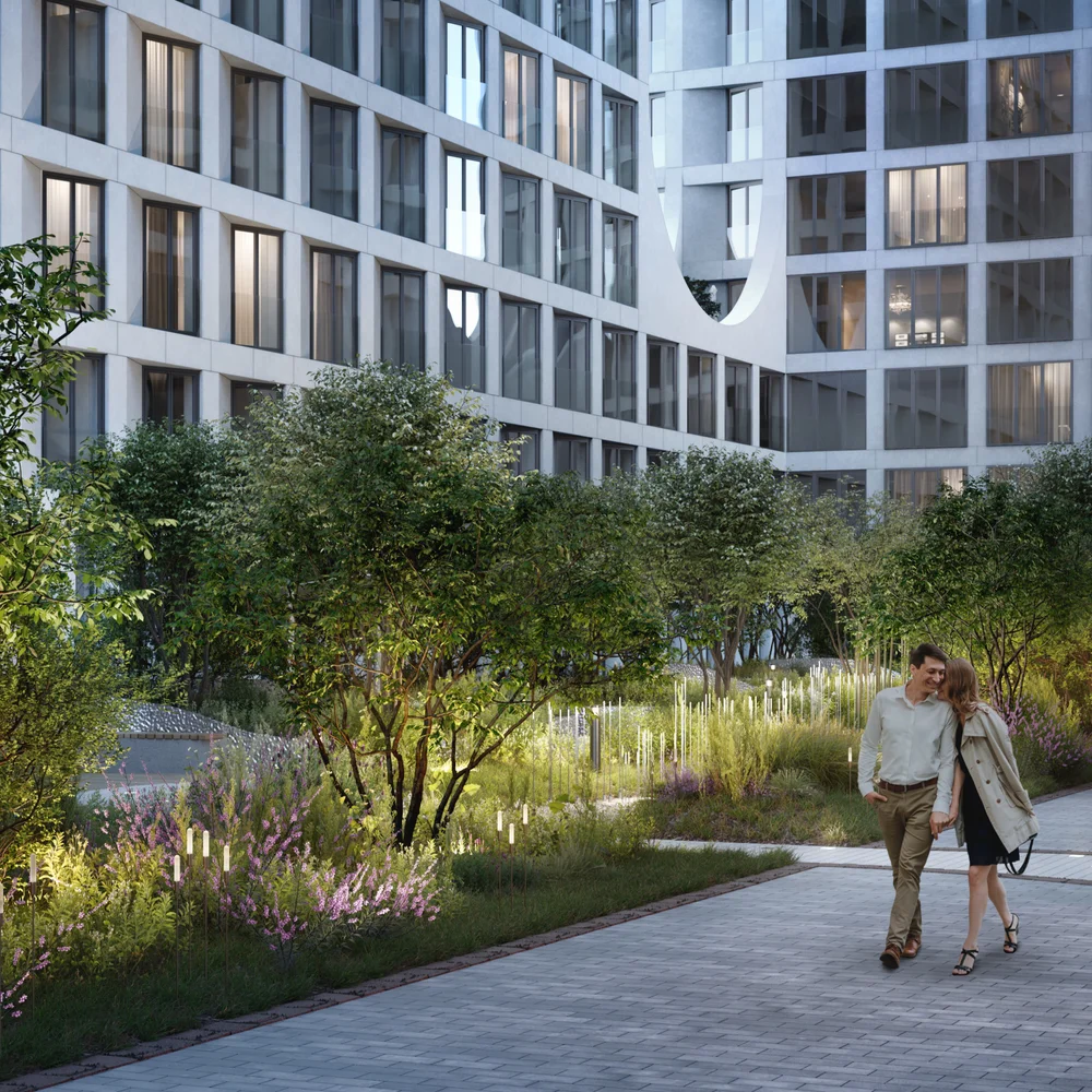 Приватный ландшафтный двор с садом площадью 3 250 м² впечатляет сочетанием красоты и функциональности. Главный променад — изящная аллея, ведущая от входной арки к гранд-лобби и подъездам, станет центром вашей прогулки. По обе стороны от променада расположены аккуратные зелёные островки из цветущих растений, разнотравья, вечнозеленые хвойных кустарников и деревьев в кадках, создавая живописные уголки для отдыха и вдохновения.