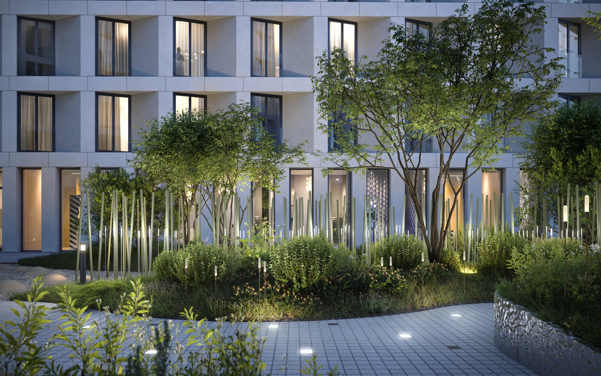 По вечерам двор превращается в почти волшебное пространство благодаря уникальной мерцающей подсветке, которая мягко преображает ландшафт и создаёт иллюзию звёздного неба, не мешая при этом жителям нижних этажей.